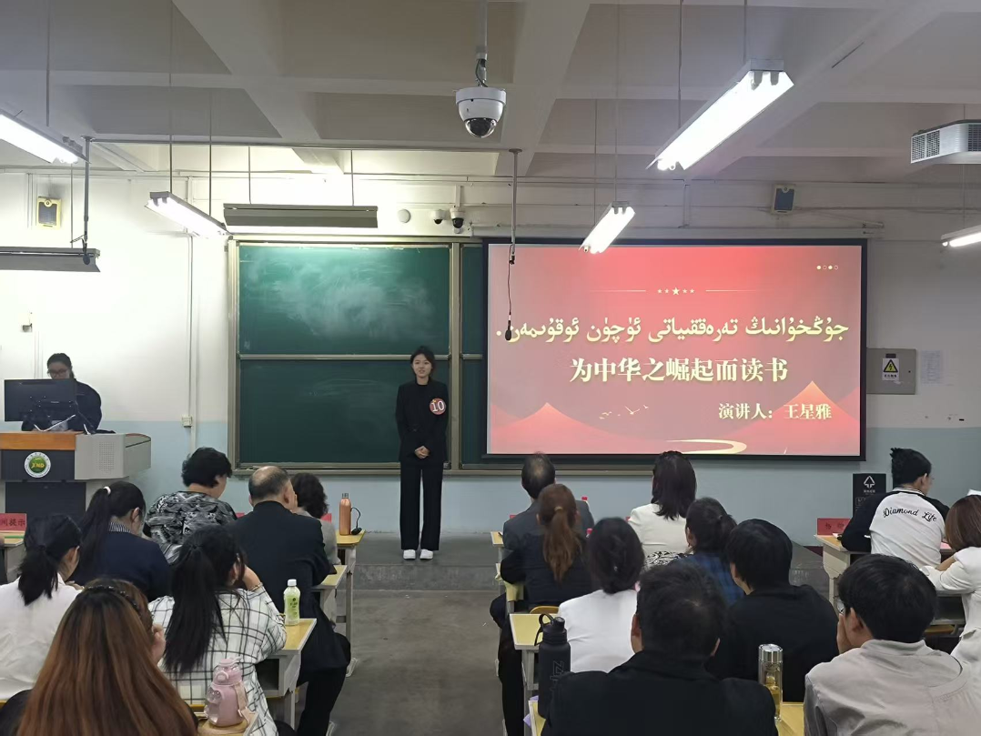 维吾尔语教研室主任阿曼古丽老师为大赛作开幕致辞。她深入阐述了举办本次大赛对于铸牢中华民族共同体意识、锻炼学生口语自信与表达能力的核心价值。她强调,语言是文化的载体,掌握国家通用语言文字和少数民族语言是促进各民族深度交融、情感相通的金钥匙,并鼓励选手们赛出水平、赛出风采。