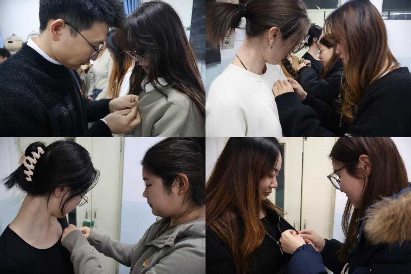 党员为预备党员佩戴党徽,党徽闪耀,既是党员身份的庄严标识,更是初心使命的生动象征。