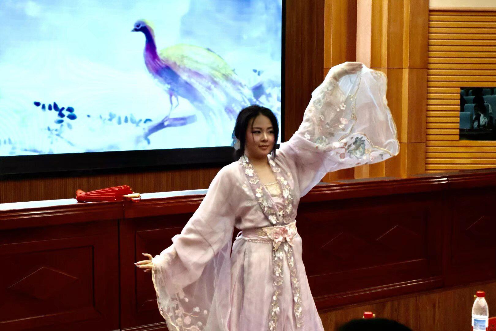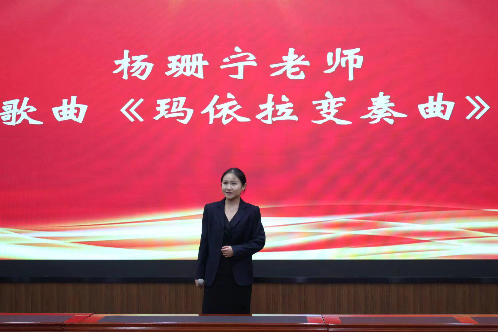 分享间隙,维语2401班钟美顺同学表演的古典舞《半壶纱》与新进教师杨珊宁演唱的《玛依拉变奏曲》,为活动增添了浓厚的艺术氛围,赢得了阵阵掌声。