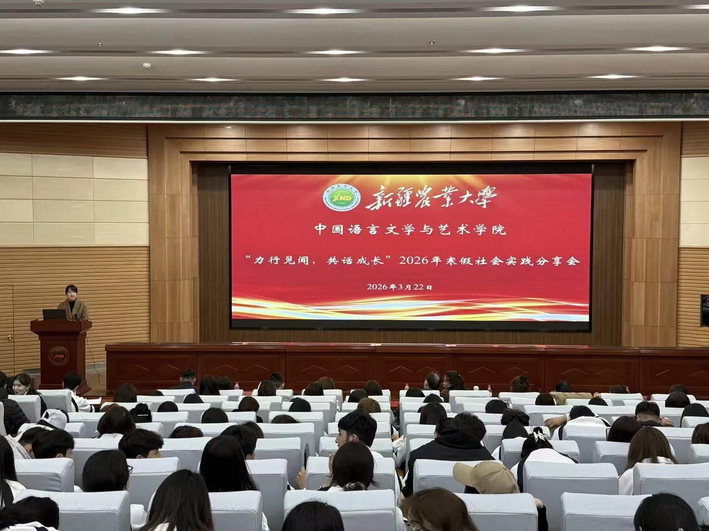 春风送暖,实践生辉。3月22日晚,中国语言文学与艺术学院“力行见闻,共话成长”2026年寒假社会实践分享会在八一礼堂问学厅成功举办。学院院长安占峰,党委副书记、纪委书记郭璇,各教研室教师代表,学工办全体老师,各班班主任与全体大二学生齐聚一堂,共同聆听学子们的实践故事,见证他们在基层沃土中的成长与蜕变。
